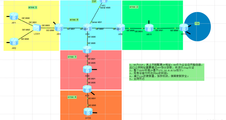 1,R5为ISP,其上只能配置IP地址;R4作为企业边界路由器,出口公网地址需要通过PPP协议获取,并进行chap认证
