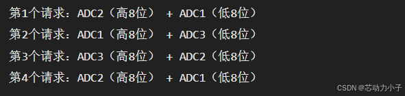 按 固定组合顺序 传输三个ADC的数据,每个字包含两个半字: