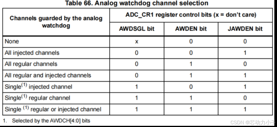 | 模拟看门狗状态位置 1 | AWD | AWDIE | 输入电压超过模拟看门狗阈值(高 / 低阈值由 ADC_HTR 和 ADC_LTR 定义) |