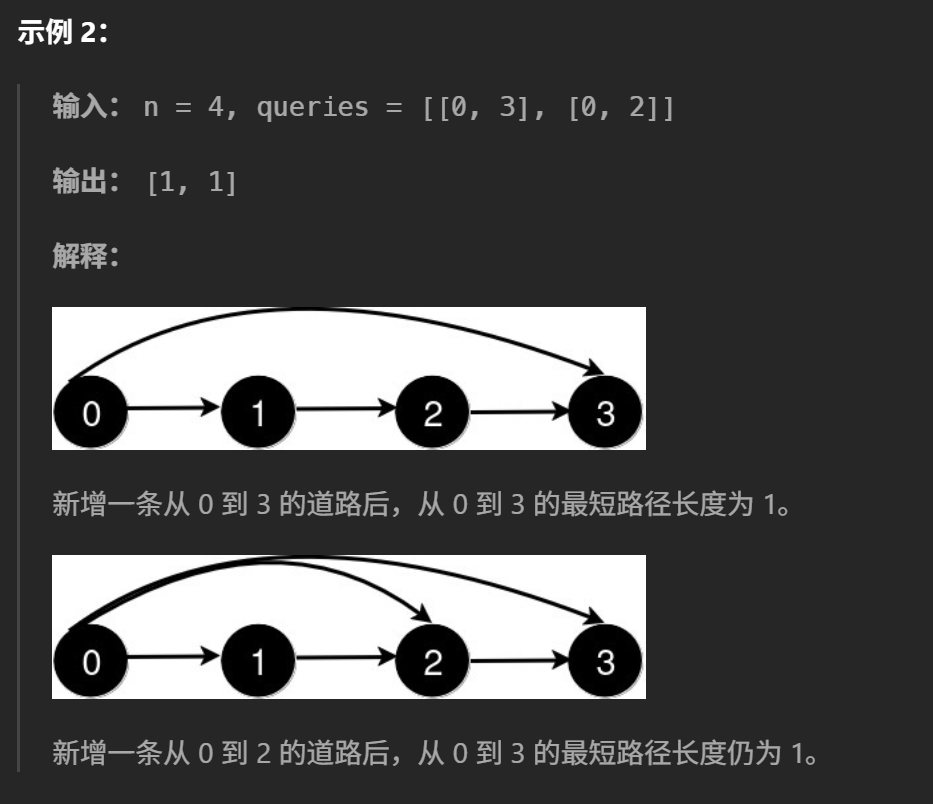 public:vector<int> shortestDistanceAfterQueries(int n, vector<vector<int>>& queries) {vector<vector<int>>prev(n);//prev[i]中存储的节点都是可以直接到达节点i的vector<int>dis(n);//节点0到节点i的距离for (int i = 1; i < n; i++){prev[i].push_back(i - 1);dis[i] = i;}vector<int>ans;for(auto&q:queries){prev[q[1]].push_back(q[0]);for(int v=q[1];v<n;v++)//添加一条q[0]->q[1]的路径后,只有q[1]及其后面的节点到节点0的距离会改变{for(int u:prev[v]){dis[v]=min(dis[v],dis[u]+1);}}ans.push_back(dis[n-1]);}return ans;}