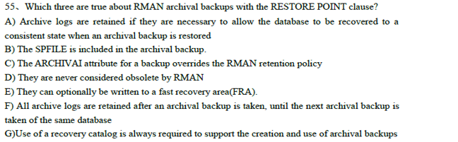 选项 B:使用 RESTORE POINT 子句的 RMAN 归档备份会包含 SPFILE ,该项正确。