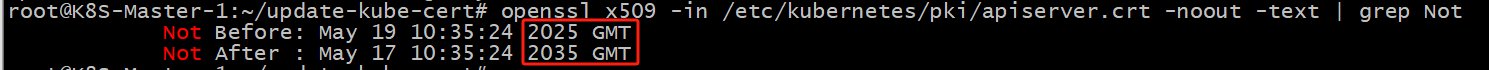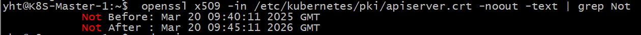 # 查看证书有效期 openssl x509 -in /etc/kubernetes/pki/apiserver.crt -noout -text | grep Not