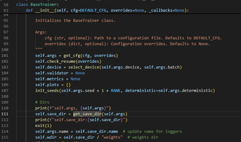 - BaseTrainer下的初始化发现了得save_dir关键词。我们在self.save_dir前后都输出关键参数的值。并在后面加上exit(1),只是debug,打印完参数结束了,而不是一直运行程序。