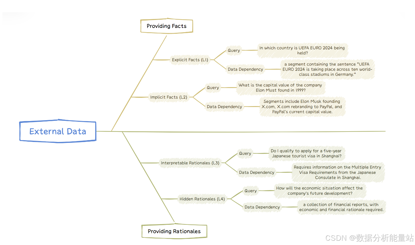 对比:前两个层级(明确事实和隐含事实)主要聚焦在如何从数据里把事实相关的信息找出来,不管是直接能看到的,还是稍微需要推导一下的,重点在于对数据本身的处理和整合,看LLM能不能把碎片化的信息整合成有条理的事实回复。而后两个层级(可解释的依据和隐藏依据)更关注LLM能不能理解数据背后深层次的“道理”,也就是依据,并且运用这些依据来生成高质量回复,这就要求LLM和专业领域的专家思维去契合,或者从杂乱的历史数据中提炼出有用的智慧,需要更深层次的认知加工和知识运用能力。