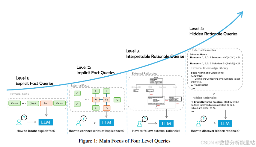 整体意义:把查询这样分类成不同层级,一方面清晰地展现出了不同查询的复杂程度变化,以及对LLM能力要求的差异;另一方面,由于每个层级都有其独特的挑战,比如有的是数据提取难,有的是依据理解运用难等,所以就提示我们需要针对各个层级的特点去制定专门的解决办法,来帮助LLM更好地应对这些不同类型的查询,从而让数据增强的LLM应用在各个场景下都能发挥出更好的效果。而且通过这样深入探究各层级,我们可以进一步了解LLM目前的能力水平,也能看到这个领域在不断进步的方向以及未来可能有哪些新的发展潜力,为后续的研究、开发等工作提供很好的参考。