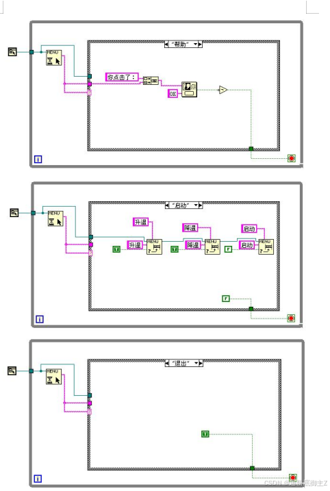 1)当VI初始运行时,升温和降温两个菜单项处于无效(Disable)状态,当用户点击启动菜单项后,这两个菜单变为使能(Enable)状态,同时启动菜单项变为无效状态;