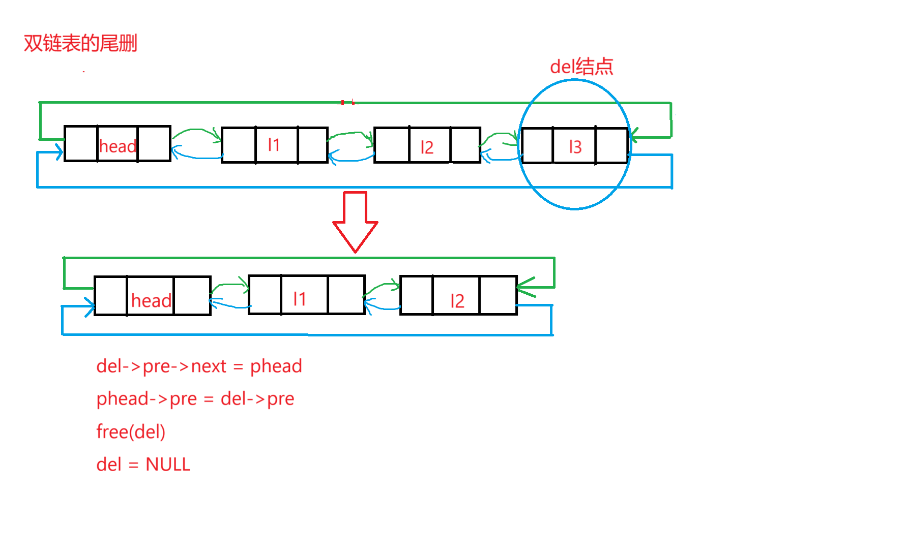 尾删的实质:在判断链表非空的情况下,先把尾结点用del保存下来方便后续操作,再让del结点的del->pre->next指向phead,并且让phead->pre指向del->pre,最后再把del结点释放掉并且置为空即可。