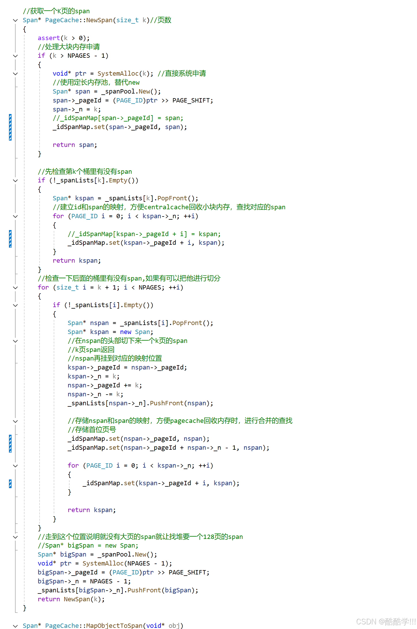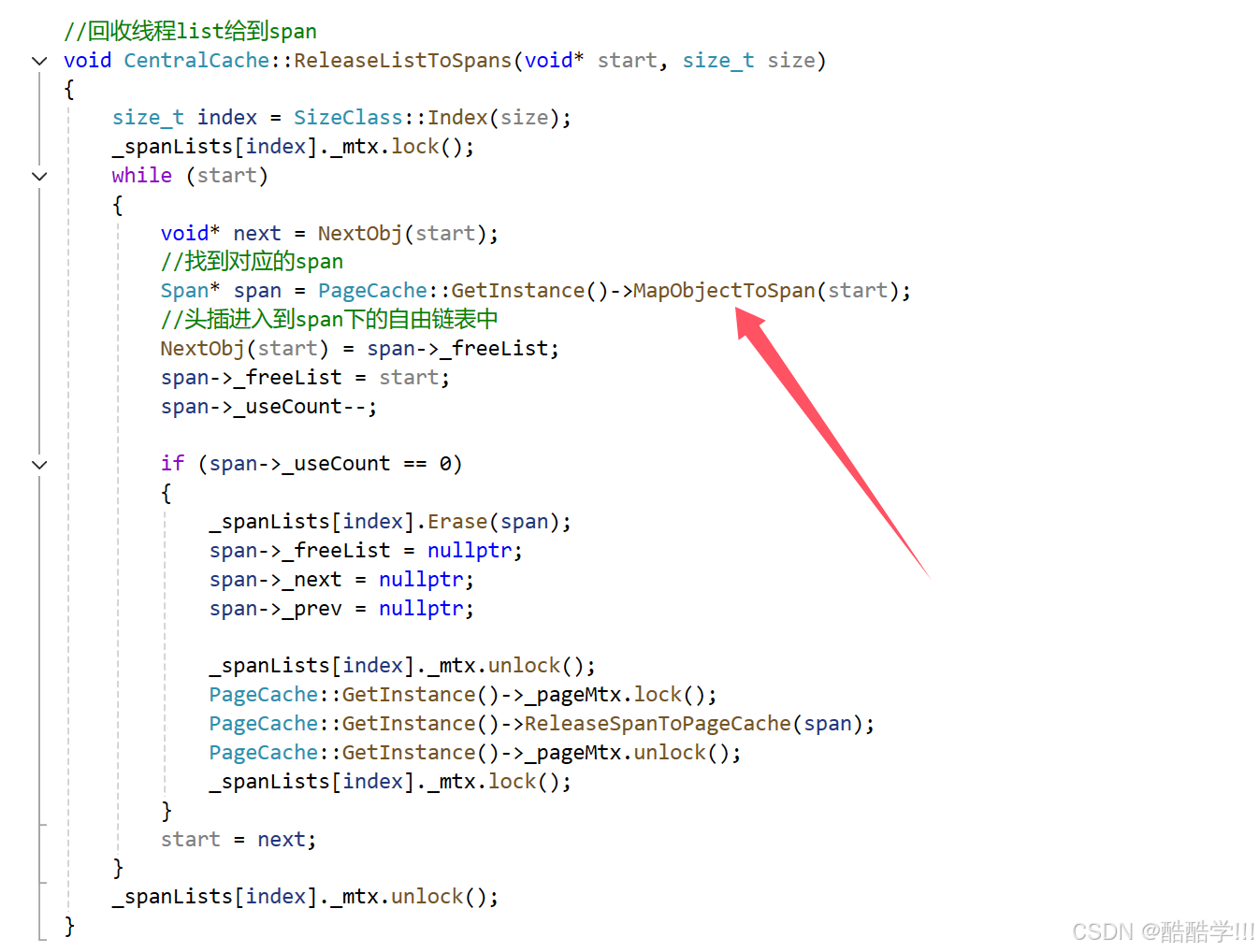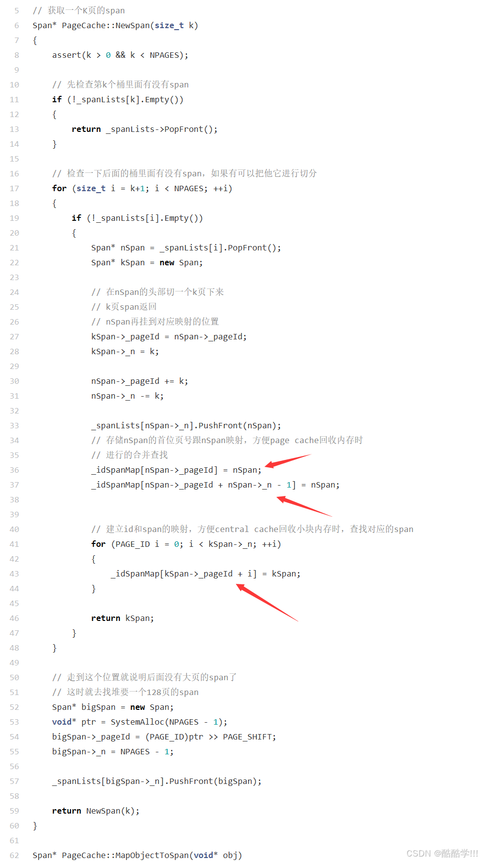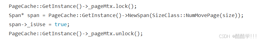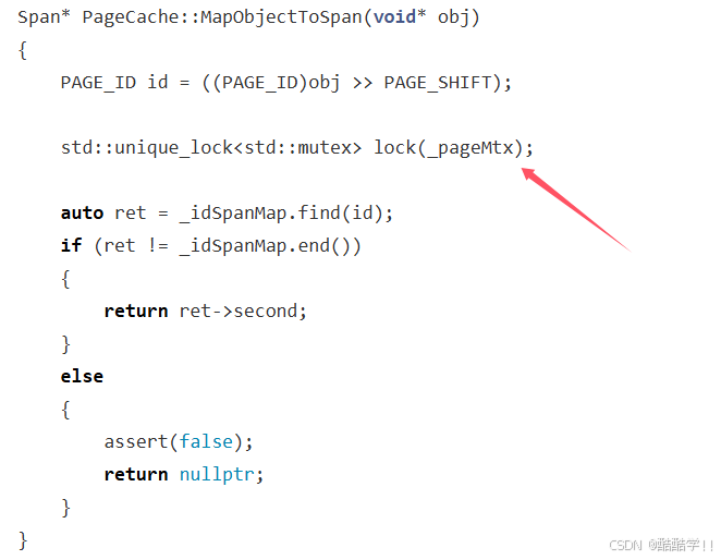 其次,读取的时候,我们需要根据页号访问到对应的span, 此时的span一定是已经被new出来之后,把页号和span*进行映射,所以我们访问时的那个span,一定时已经存在的,不会涉及正在读取此span,又被其他线程所修改,按照本项目访问所涉及到的代码进行讲解:
