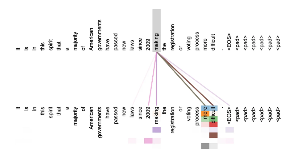 为每个词找到重要上下文,这部分即是量化了句子中任意两个词条之间的依赖关系。如下图将会去对输入句子做比较,即每个词之间又会对句子中所有词做比较