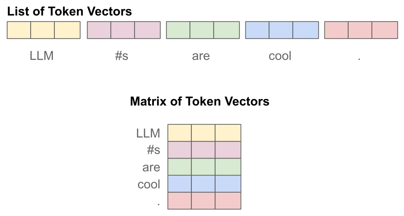 embeddings = [[0.1, 0.2, 0.3], # "LLM"的嵌入[0.4, 0.5, 0.6], # "#s"的嵌入[0.7, 0.8, 0.9], # "are"的嵌入[1.0, 1.1, 1.2] # "cool"的嵌入