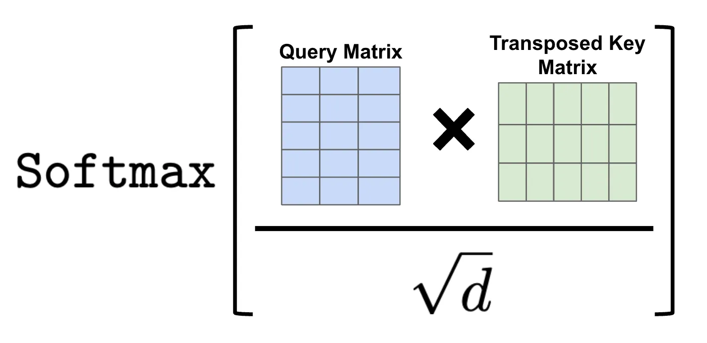 为了提升训练稳定性,我们将注意力矩阵中的每个值除以 √d(d 是向量维度,然后对矩阵的每一行应用 softmax 操作。