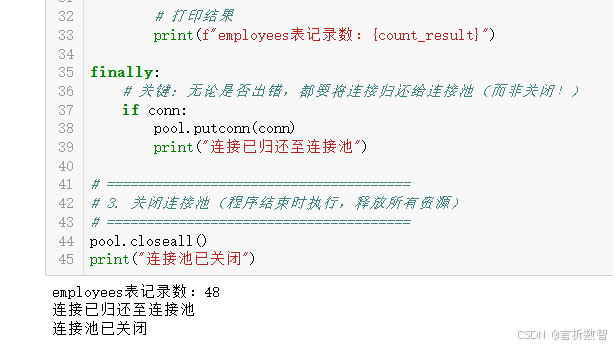 try:# 获取一个数据库连接(如果池中有空闲连接则直接获取,否则新建直到maxconn)conn = pool.getconn()# 使用上下文管理器创建游标(自动关闭游标)with conn.cursor() as cur:# 执行SQL查询(统计employees表的记录数)cur.execute("SELECT COUNT(*) FROM employees")# 获取查询结果(COUNT(*)返回一行一列,使用fetchone())# fetchone()返回元组,例如:(100,),[0]获取第一个元素count_result = cur.fetchone()[0]# 打印结果print(f"employees表记录数:{count_result}")finally:# 关键:无论是否出错,都要将连接归还给连接池(而非关闭!)if conn:pool.putconn(conn)print("连接已归还至连接池")# ======================================