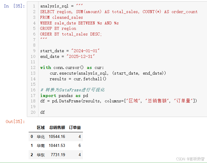 df = pd.DataFrame(results, columns=["区域", "总销售额", "订单量"])df