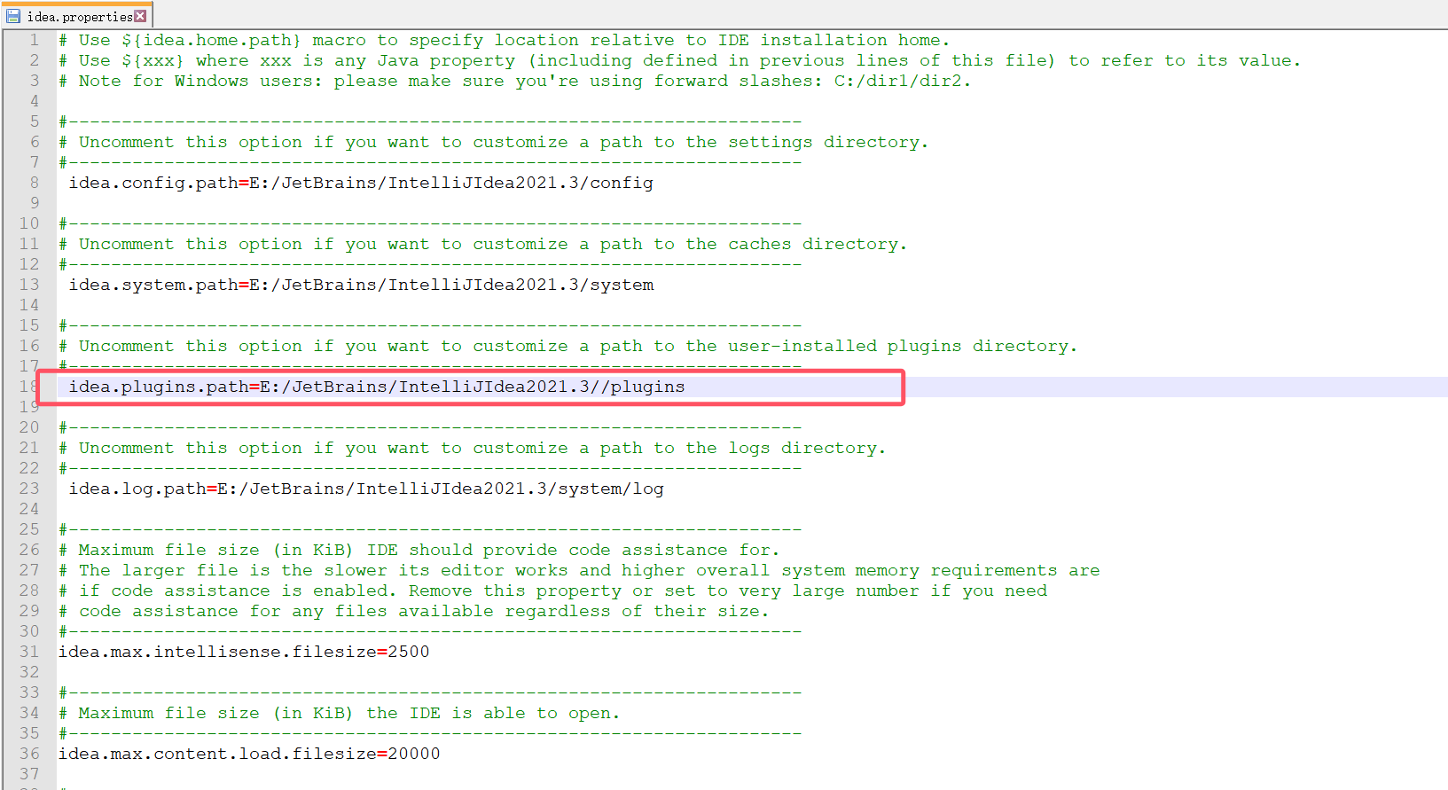 2,然后再找到idea.properties文件,打开,如图就可以找到idea编译器中插件的安装目录