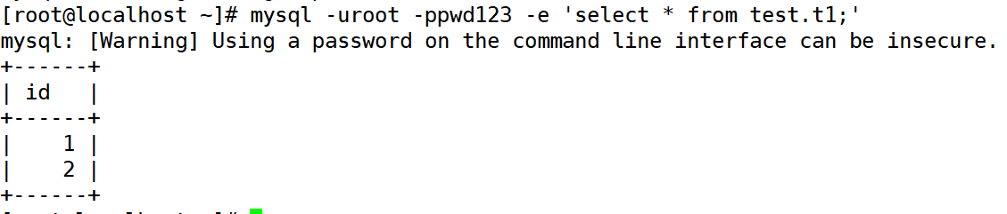 为方便验证二进制日志的增量恢复功能,在插入二条用户数据后先对test 数据库的 t1表进行一次完全备份。然后在 Linux 系统命令行下执行’“mysqladmin -uroot -p flush-logs”命令或在“mysql>”命令提示符下执行“flush logs;”生成新的二进制日志。