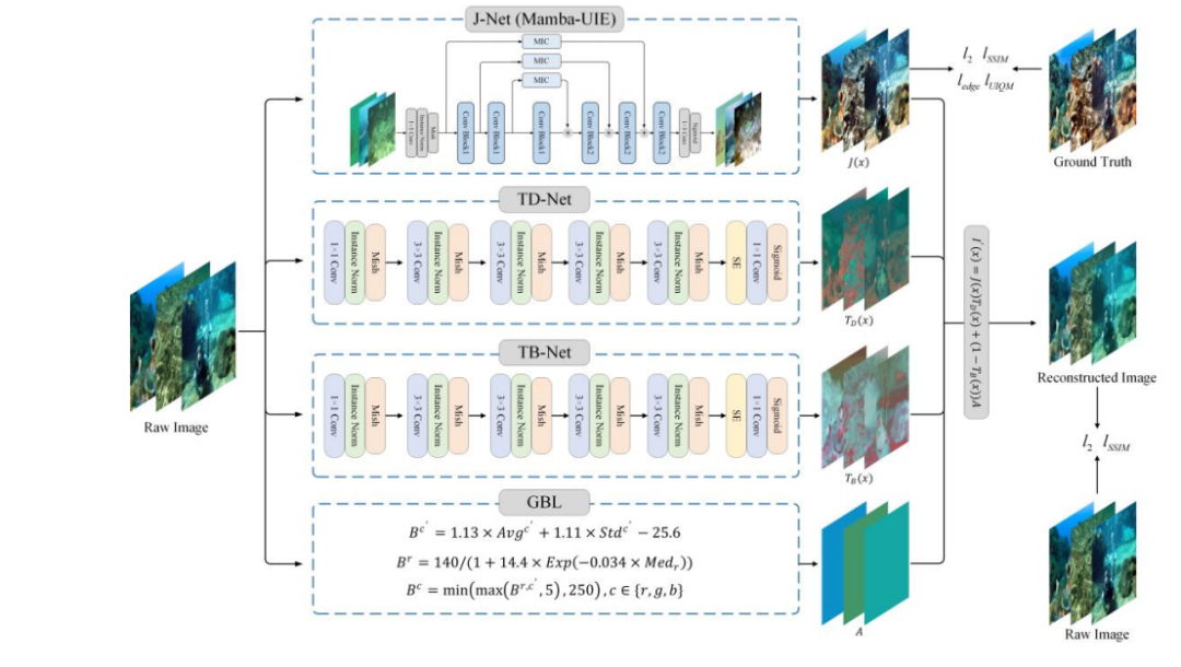 物理模型约束框架:基于修订的水下图像形成模型,将输入图像分解为四个组件:水下场景辐射度、直接传输图、后向散射传输图和全局背景光。