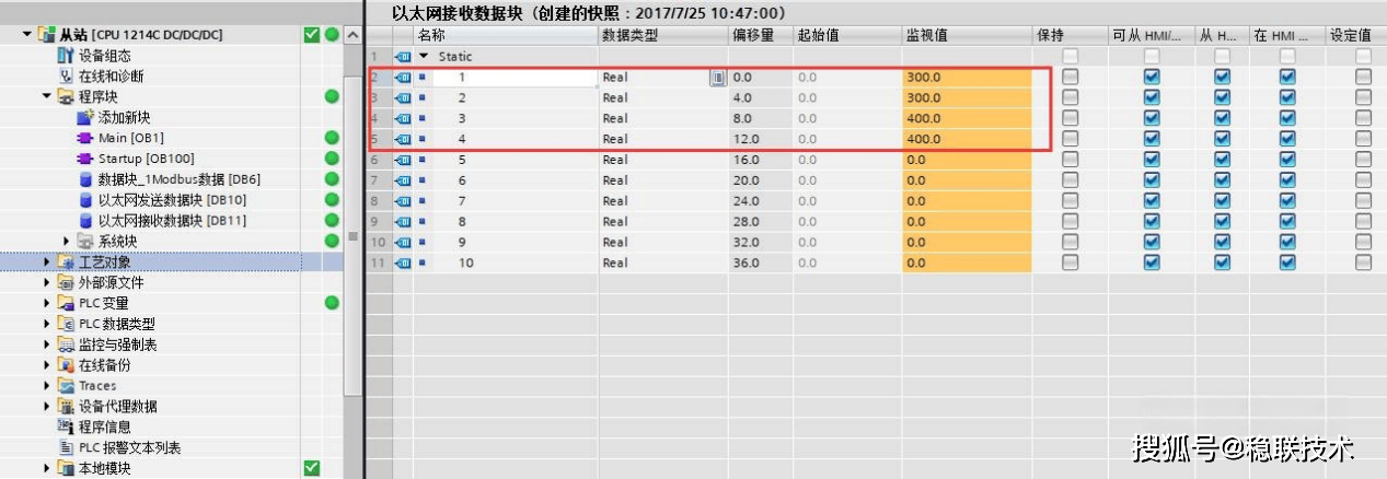 从站、主站新建全局DB块,分别命名为(从站:以太网发送数据块)、(主站:以太网接收数据块)分别在里面新建一些存储区,并分别与程序块的相关管脚相关联。如图: