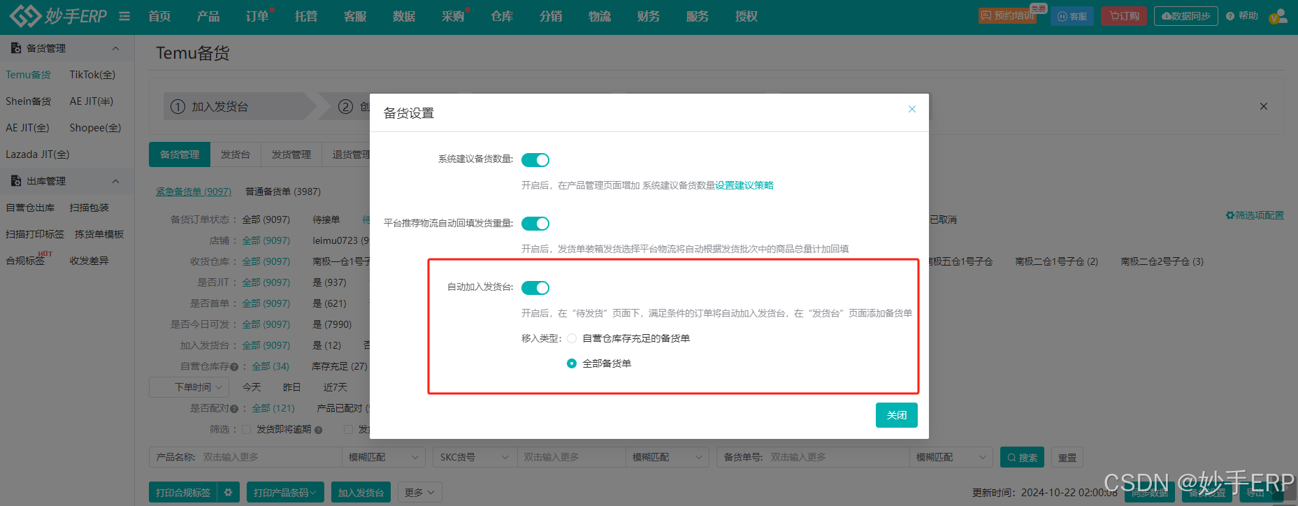 妙手帮您轻松搞定!卖家朋友在TEMU备货-【备货设置】中开启自动加入发货台后,当店铺出单时,系统自动将符合条件的备货单加入发货台,无需卖家手动接单,减少人力、时间成本。