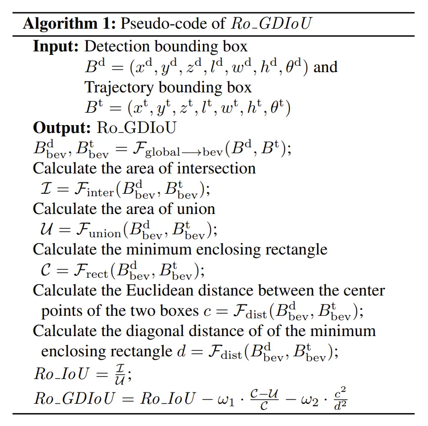 基于此,我们提出了Ro_GDIoU,这是一种融合了旋转角、交并比与中心距离的更强相似度计算方法。旋转角的引入如图所示:当将3D框投影到BEV平面时,这些框通常会呈现不同的角度。如果像在2D检测任务中那样将其“掰正”,将无法准确衡量两个框的真实相似度。因此,需要按照它们的实际朝向来计算交并比,以更准确地反映它们的相似性。