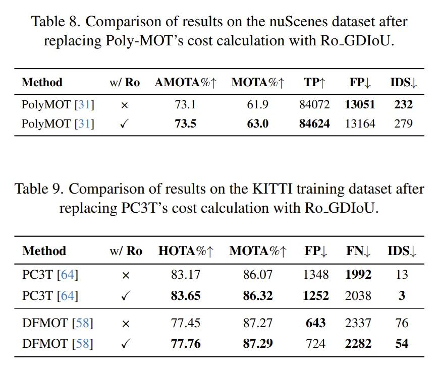 5.3 消融实验将本文提出的Ro_GDIoU分别融合到当前KITTI和nuScenes的SOTA方法中,其中PolyMOT在当时的nuScenes排名中位居第一。我们发现,将Ro_GDIoU应用于该方法时,MOTA指标提升了1.1个点,同时nuScenes的主要评价指标AMOTA也提升了0.4个点。此外,在另一个数据集KITTI上,使用当时的SOTA方法结合Ro_GDIoU也实现了不同程度的提升。