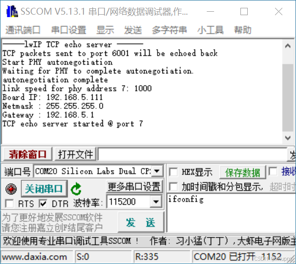 查看串口输出内容,如下所示,修改的IP等信息也会在此打印出来。