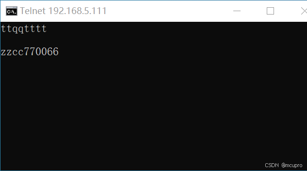 连接上后会打开一个Telnet窗口,在窗口中输入内容,开发板接收到内容后立即从网口发出,形成回环测试。
