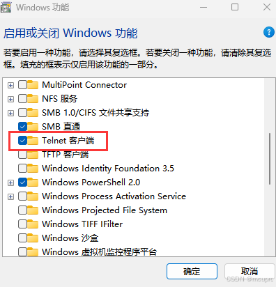 若提示没有telnet命令,在电脑中搜索windows功能,打开后勾选Telnet客户端选项,点击确定即可。