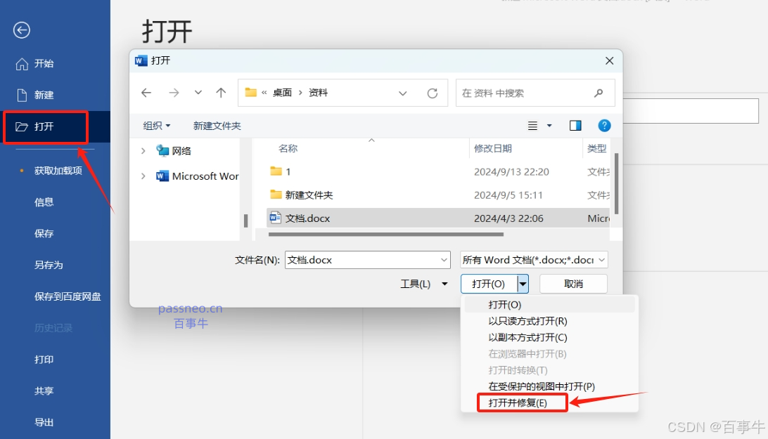 1、尝试修复文档:在Word中,点击“文件”>“打开”,弹出对话框后,找到该文件,然后点击工具列表中的“打开并修复”。