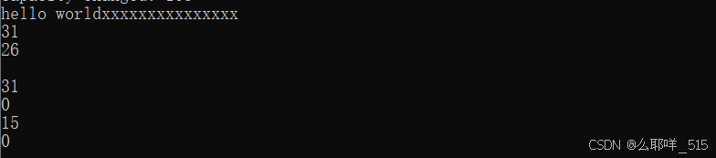 string s1("hello worldxxxxxxxxxxxxxxx")cout << s1 << endl;cout << s1.capacity() << endl;cout << s1.size() << endl;//只清理数据,不清理空间s1.clear();cout << s1 << endl;cout << s1.capacity() << endl;cout << s1.size() << endl;// 缩容,默认缩容到15s1.shrink_to_fit();cout << s1.capacity() << endl;cout << s1.size() << endl;