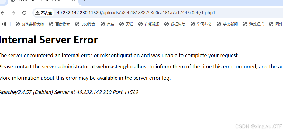 访问页面,服务器内部错误,可能是解析不了,我们上传一个.htaccess或者.user.ini来解析它