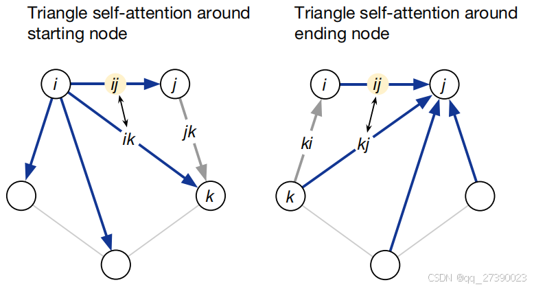 TriangleAttentionStartingNode处理源节点(行方向),捕获“从源到目标”的交互。捕获“从源到目标”的交互。TriangleAttentionEndingNode处理目标节点(列方向),捕获“从目标到源”的交互。