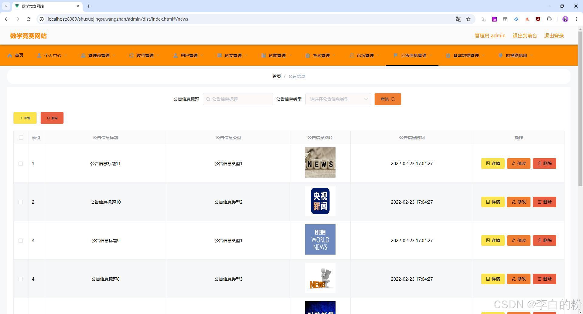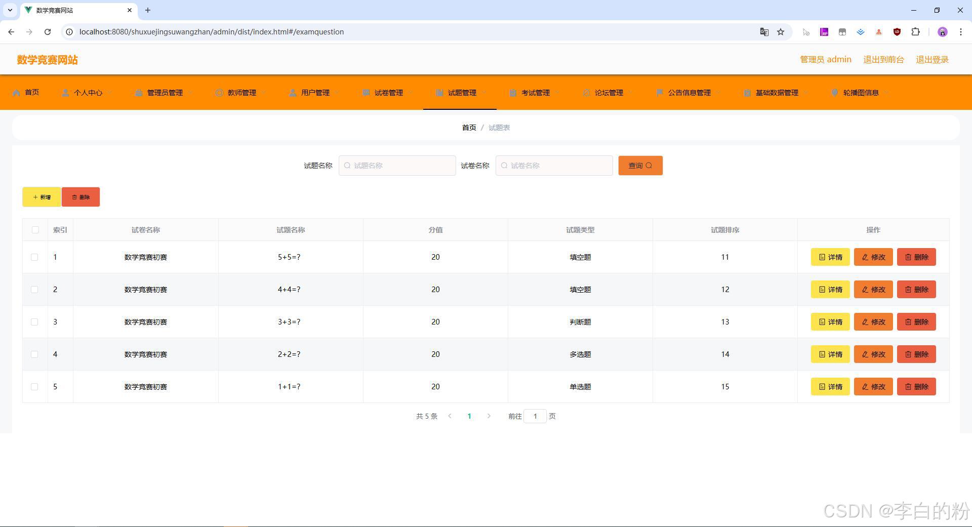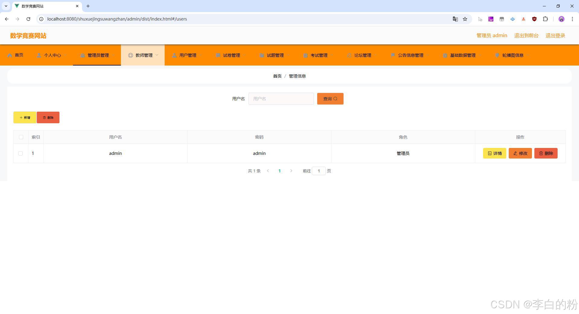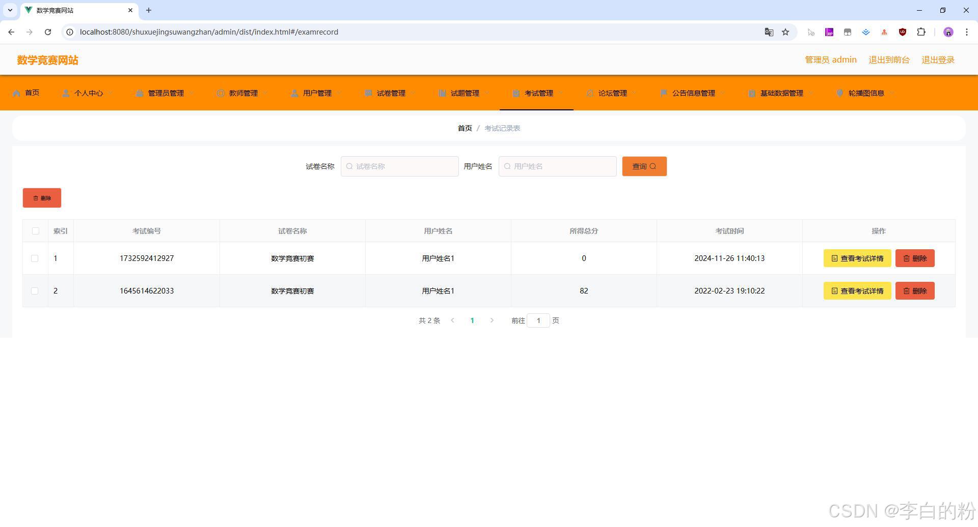 基于ssm的数学竞赛网站,前端采用的是html+vue,后端采用spring+springmvc+mybatis,系统采用MVC三层架构,系统分后台管理与web端页面,功能齐全,代码简洁易懂,适合小白学编程...
