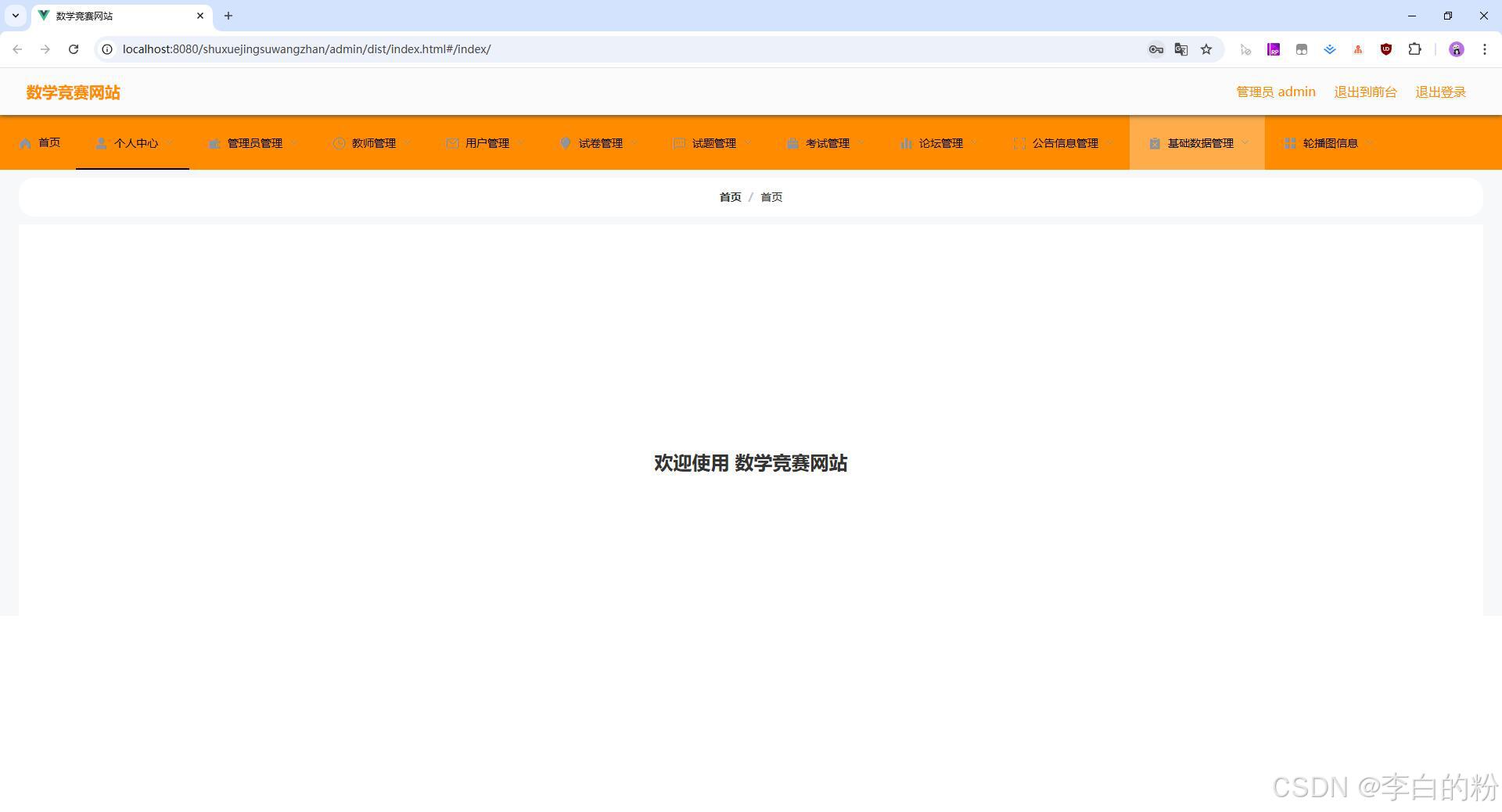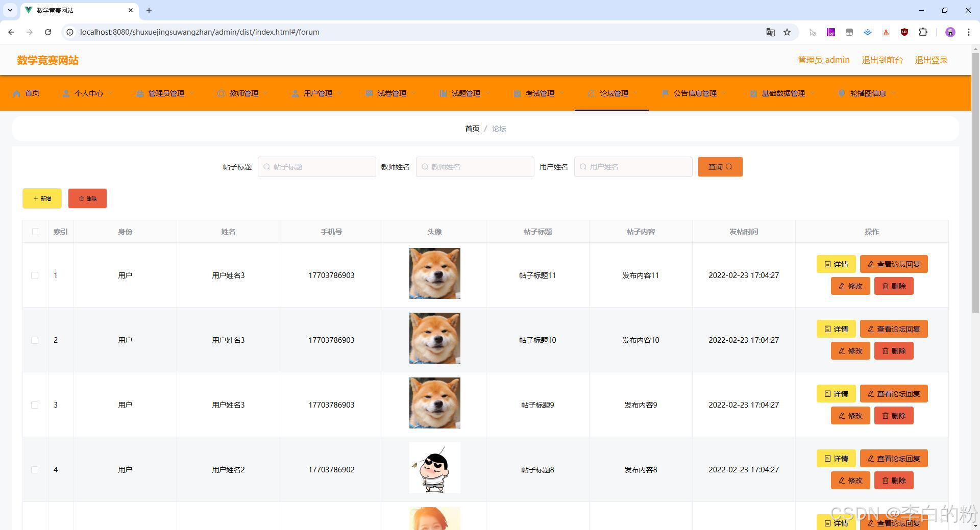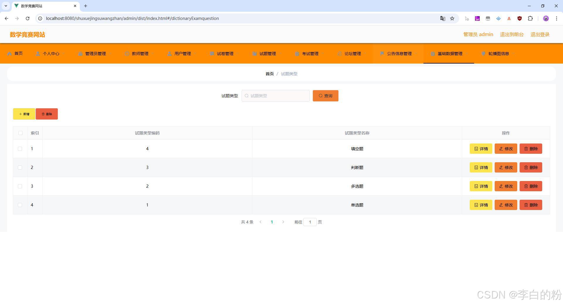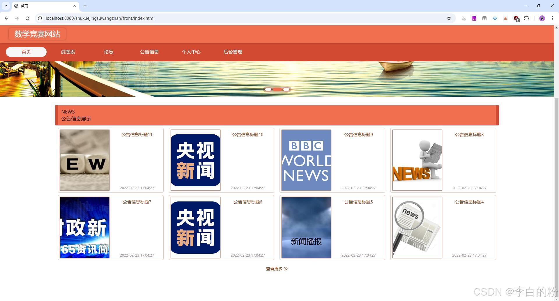 基于ssm的数学竞赛网站,前端采用的是html+vue,后端采用spring+springmvc+mybatis,系统采用MVC三层架构,系统分后台管理与web端页面,功能齐全,代码简洁易懂,适合小白学编程...