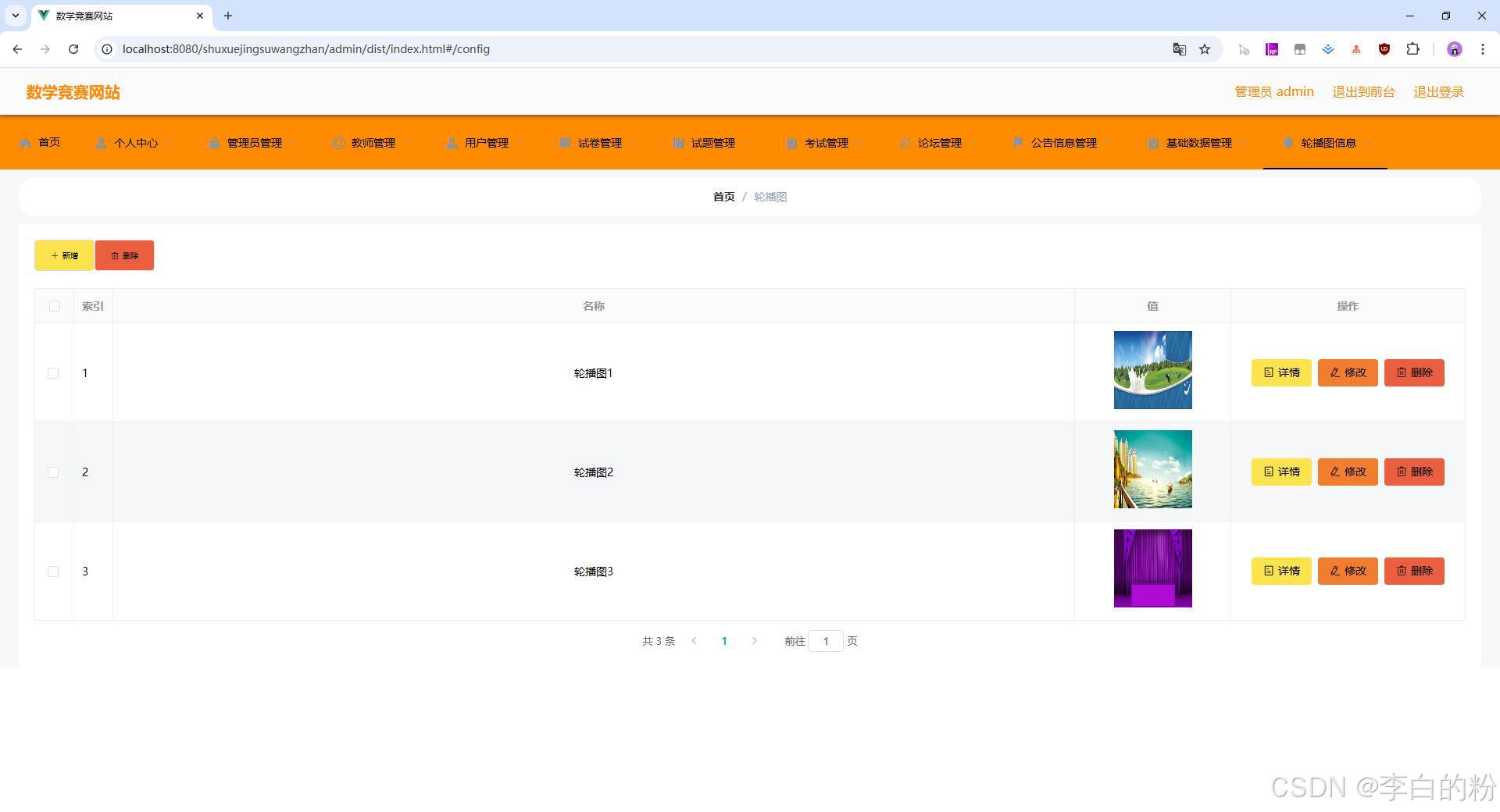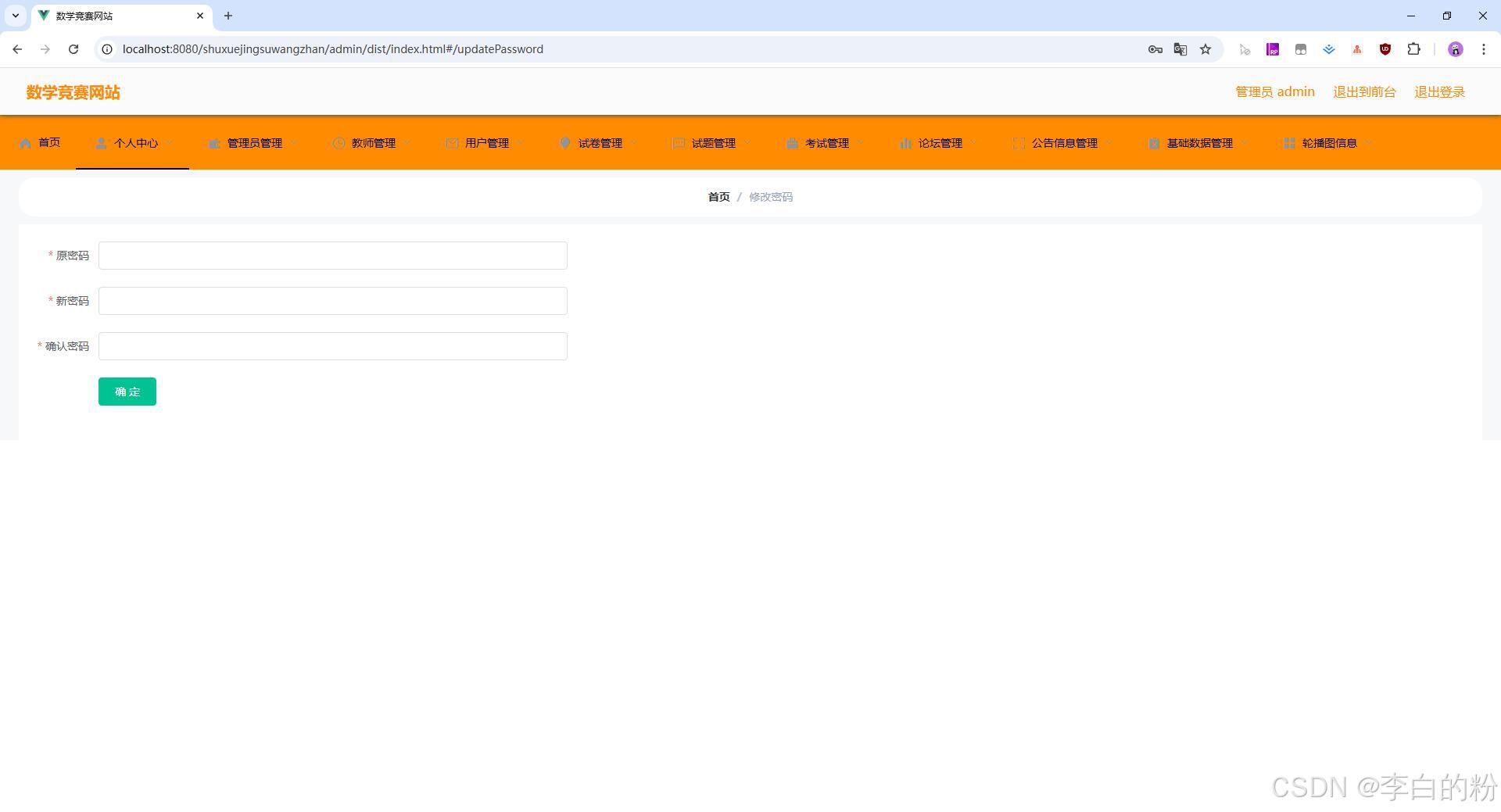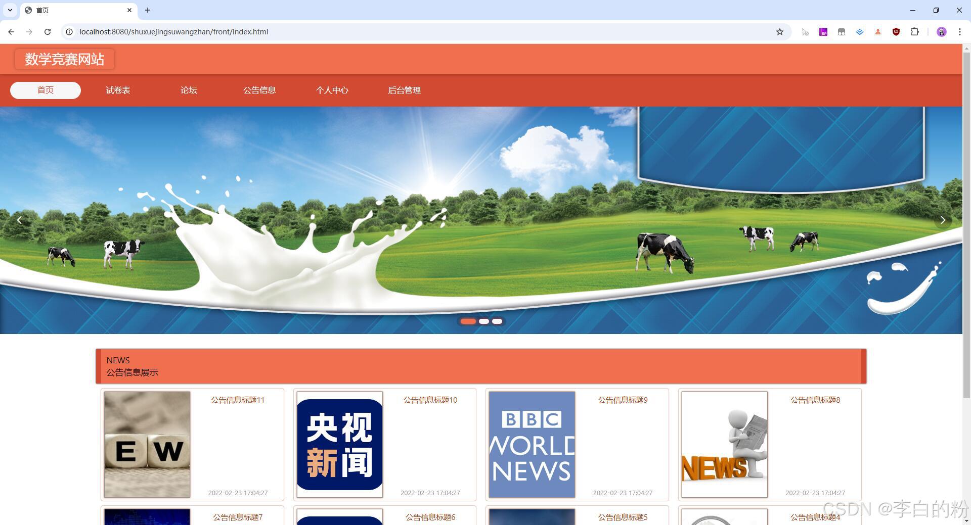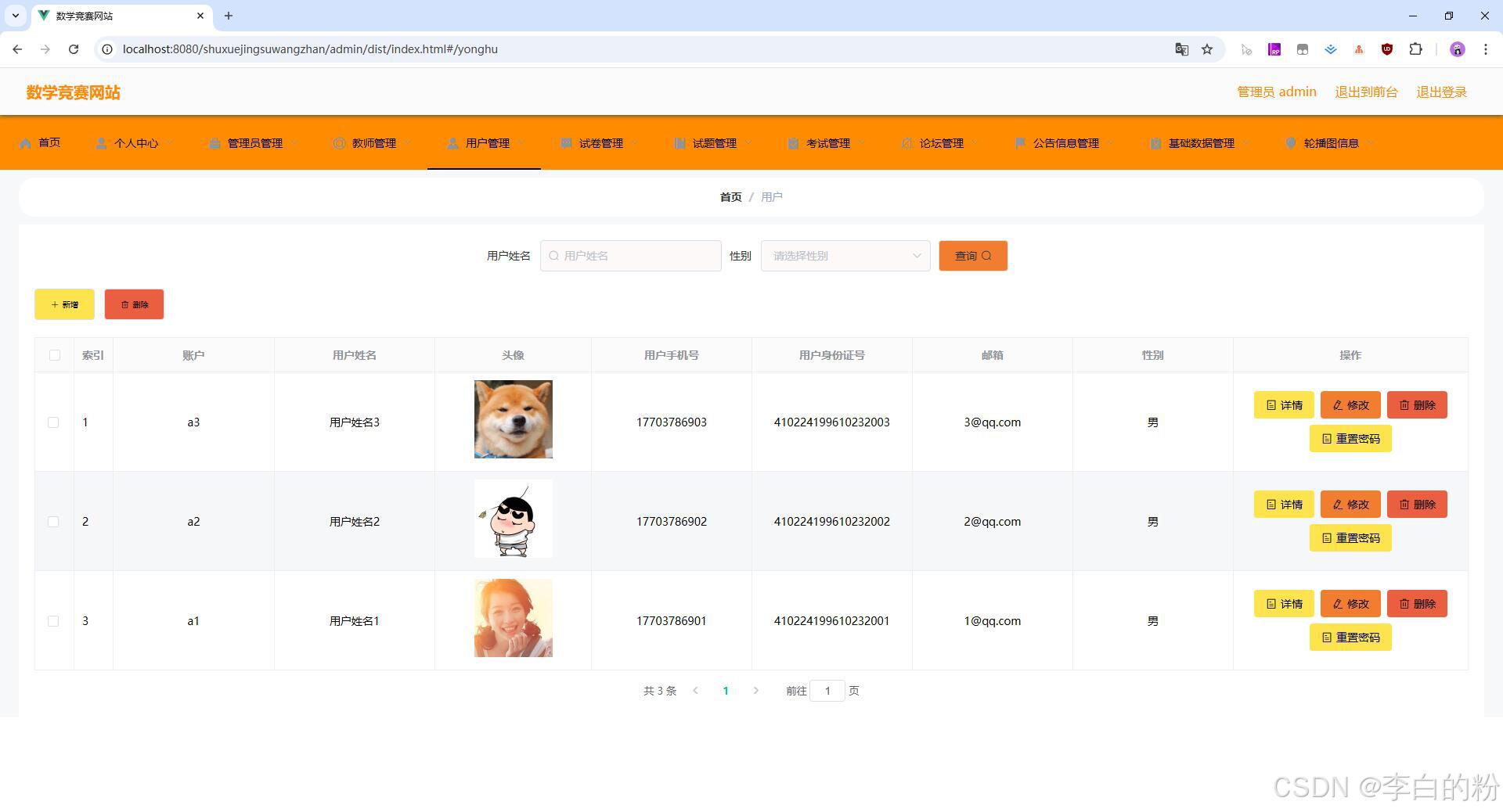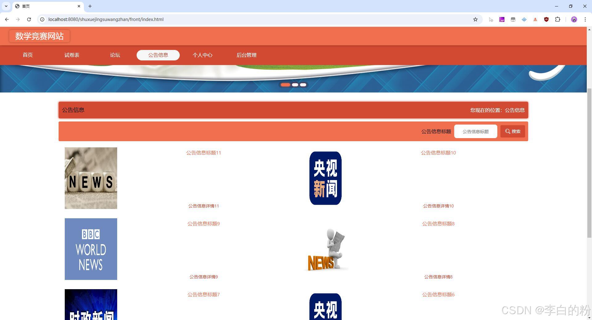 基于ssm的数学竞赛网站,前端采用的是html+vue,后端采用spring+springmvc+mybatis,系统采用MVC三层架构,系统分后台管理与web端页面,功能齐全,代码简洁易懂,适合小白学编程...