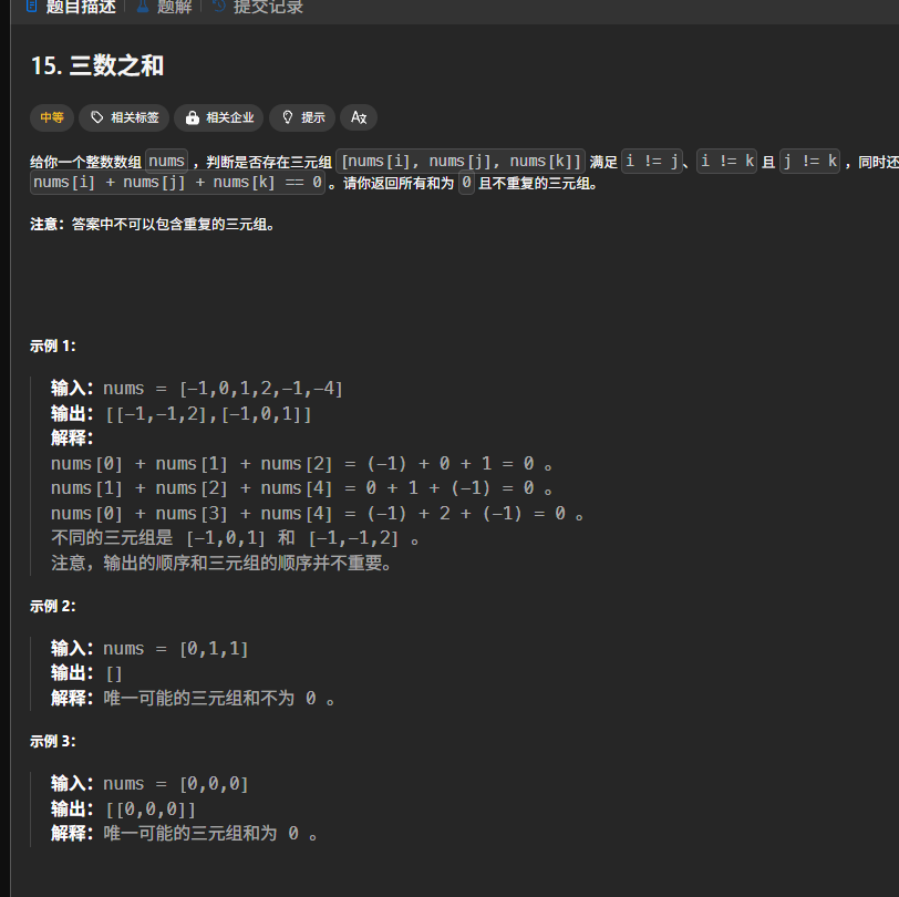 public:vector<vector<int>> threeSum(vector<int>& nums) {vector<vector<int>> count;sort(nums.begin(), nums.end());for (int i = 0; i < nums.size(); i++) {int l = i + 1, r = nums.size() - 1, target = -nums[i];if (i > 0 && nums[i] == nums[i - 1])continue;while (l < r) {int sum = nums[r] + nums[l];if (sum == target) {count.push_back({nums[i], nums[l], nums[r]});while (l < r && nums[l] == nums[l + 1])++l;while (l < r && nums[r] == nums[r - 1])--r;++l;--r;} else if (sum > target) {r--;} else {l++;}}}return count;}