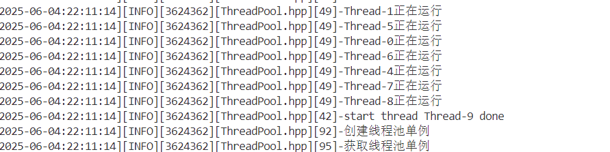 private:ThreadPool(int threadnum = gdefaultthreadnum) : _threadnum(threadnum),_isrunning(false),_waitnum(0){LOG(LogLevel::INFO) << "ThreadPool Construct";}void InitThreadPool(){for (int num = 0; num < _threadnum; ++num){_threads.emplace_back(std::bind(&ThreadPool::HandlerTask, this));LOG(LogLevel::INFO) << "init thread " << _threads.back().Name() << " done";}}void start(){_isrunning = true;for (auto &thread : _threads){thread.Start();LOG(LogLevel::INFO) << "start thread " << thread.Name() << " done";}}void HandlerTask(){std::string name = GetThreadNameFromNptl();LOG(LogLevel::INFO) << name << "正在运行";while (true){_mutex.Lock();while (_task_queue.empty() && _isrunning){_waitnum++;_cond.Wait(_mutex);_waitnum--;}if (_task_queue.empty() && !_isrunning){_mutex.Unlock();break;}T t = _task_queue.front();_task_queue.pop();_mutex.Unlock();LOG(LogLevel::INFO) << name << "get a task";t();}}ThreadPool<T> &operator=(const ThreadPool<T> &threadpool) = delete;ThreadPool(const ThreadPool<T> &threadpool) = delete;public:static ThreadPool<T> *GetInstance(){if (_inst == nullptr){LockGuard guard(_mutex);if (_inst == nullptr){_inst = new ThreadPool<T>();//简单说下为什么静态成员函数可以访问类的构造函数//如果是普通的成员函数,需要一个具体的对象,因为需要this指针//而构造函数并不需要this指针//如果是public的话就算在类外,没有具体的对象也可以直接调用构造函数//但是如果时private的话,那么就只能通过类的成员函数进行调用了//这里的GetInstance只是没有this指针而已,无法访问其他类成员函数//但他本质还是一个类成员函数,所以可以访问作为私有成员函数的且不需要this指针的构造函数_inst->InitThreadPool();_inst->start();LOG(LogLevel::INFO) << "创建线程池单例";}}LOG(LogLevel::INFO) << "获取线程池单例";return _inst;}void stop(){// 这里不能使用LockGuard,因为后面唤醒所有线程时,所有线程需要争抢手上这把锁// 但是这把锁因为LockGuard,要最后才能释放// 就导致该主线程又不释放锁,还在等其他线程拿到锁才能退出,直接死掉了// 这种循环等待,和“死锁”不完全一样// “死锁”是互相等待对方线程的锁但自己又不释放自己的锁_mutex.Lock();_isrunning = false;_cond.NotifyAll();LOG(LogLevel::DEBUG) << "线程池退出中";_mutex.Unlock();Wait();}void Wait(){for (auto &thread : _threads){thread.Join();LOG(LogLevel::DEBUG) << thread.Name() << "退出...";}}bool Enqueue(const T &in){bool ret = false;_mutex.Lock();if (_isrunning){_task_queue.push(in);if (_waitnum > 0)_cond.Notify();LOG(LogLevel::DEBUG) << "任务入队列成功";ret = true;}_mutex.Unlock();return ret;}private:static ThreadPool<T> *_inst;int _threadnum;std::vector<Thread> _threads;std::queue<T> _task_queue;static Mutex _mutex;Cond _cond;int _waitnum;bool _isrunning;