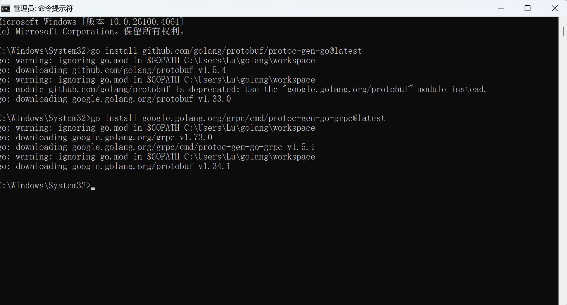 2.在命令提示符中安装 protoc-gen-go 程序