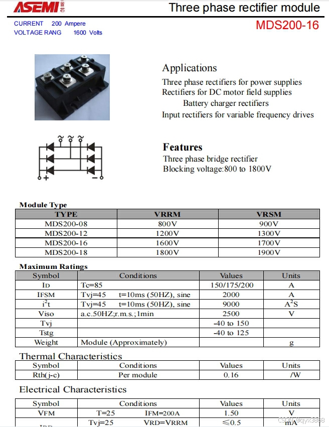 MDS200-16-ASEMI整流模块广泛应用在大功率开关电源,工业电源,工业自动化设备,家用电器,家用小电器等相关电器产品。