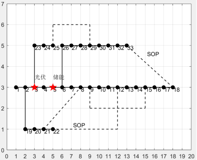 网络拓扑图:图二展示了配电网中分布式电源(光伏)和储能的配置位置,以及通过灵活开关(SOP)实现的电力流动调整。结果表明,优化配置的分布式电源和储能系统能够有效缓解极端天气下的电压波动问题,提高配电网的抗扰性。