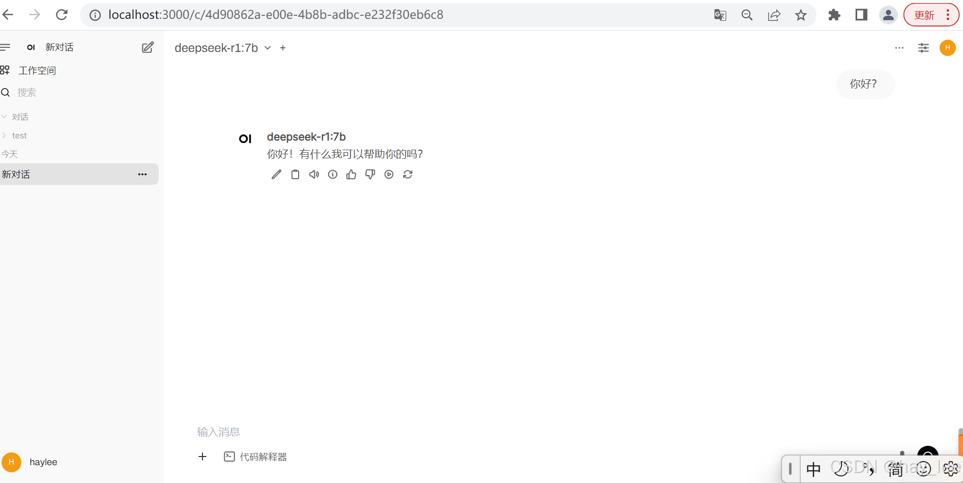 等docker容器启动后,就可以在浏览器输入:http://localhost:3000就可以跟本地的deepseek聊天了。