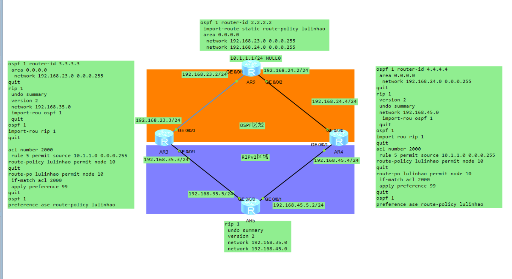 如图所示,AR2、AR3、AR4三者同属与OSPF区域1,AR5、AR3、AR4三者同属于RIP-1区域,根据设备名称,我们现在接口上配置好相关的IP地址,然后在AR2中引入一个10.1.1.0 24 的黑洞路由用来作测试,其意义可以不管