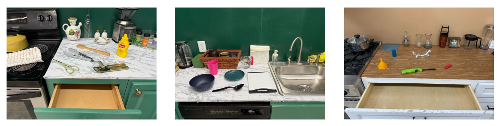 语言跟随实验使用两个未见过的厨房场景来测试模型对更具体用户指令的执行能力,例如“把剪刀放进抽屉”或“把切菜板放入水槽”。每次试验要求机器人解读指令,在干扰物中识别正确物体并执行任务。我们评估两种情景: