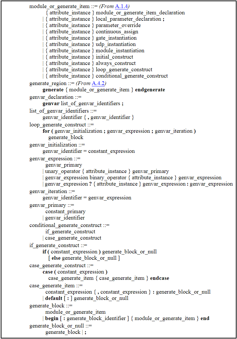 一个生成块是由一个或多个模块项组成的,生成块中不能有端口声明、参数声明、Specify块和Specparam声明,除此之外,所有能在模块中出现的项目(包括嵌套的生成块结构)都允许出现在生成块中。生成块提供了一种机制,使参数可以影响模块内的结构,还允许以简洁的方式描述模块内的重复结构。
