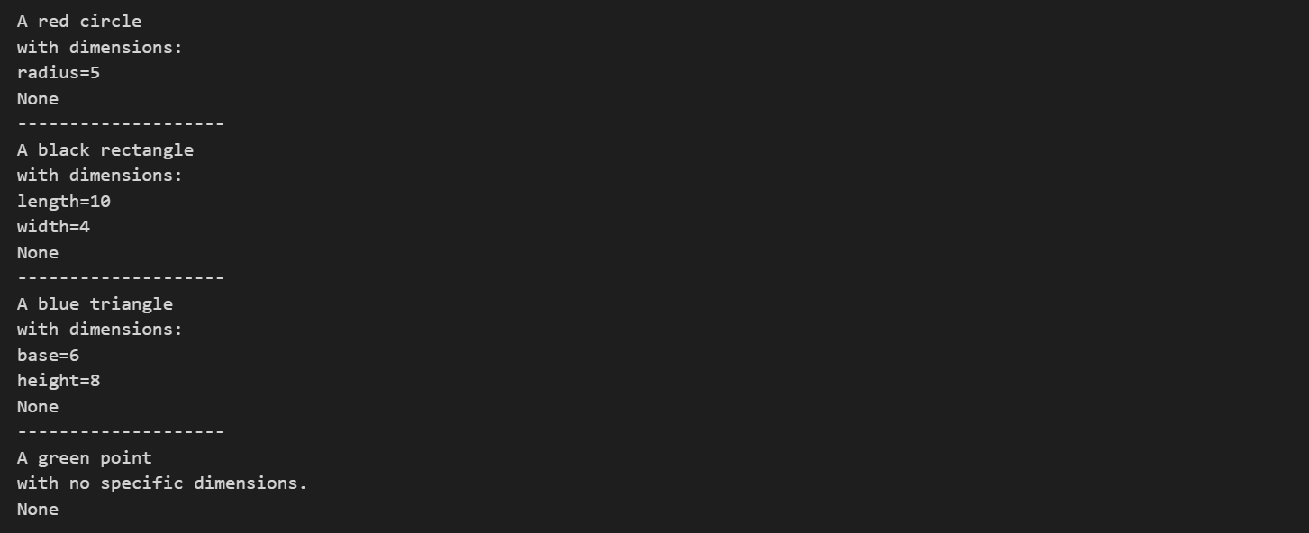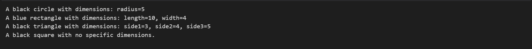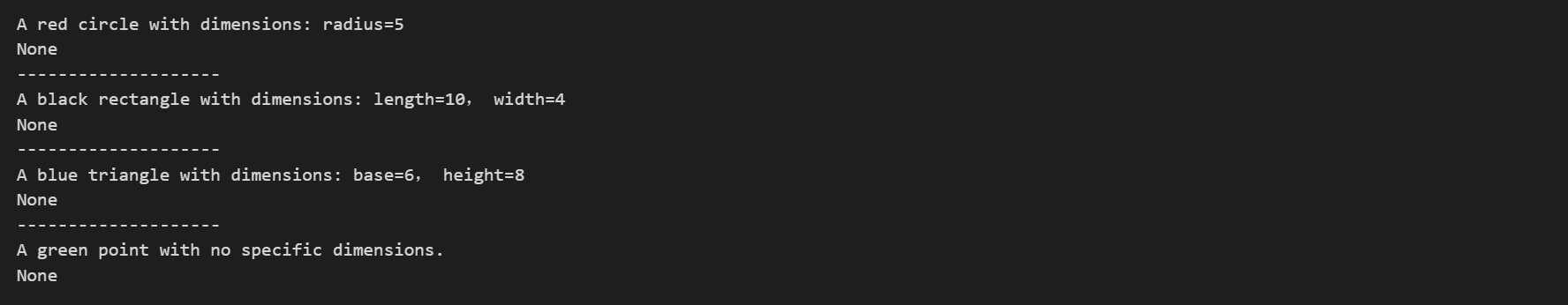 ○ “A [color] [shape_name] with dimensions: [dim1_name]=[dim1_value], [dim2_name]=[dim2_value], …”如果 **kwargs 为空,则尺寸部分为 “with no specific dimensions.”