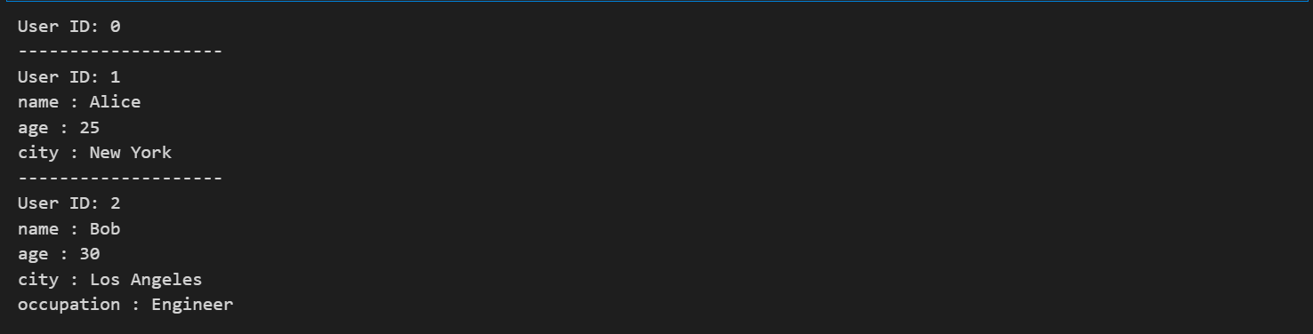 ○ 函数打印出用户ID,然后逐行打印所有提供的额外信息(键和值)。