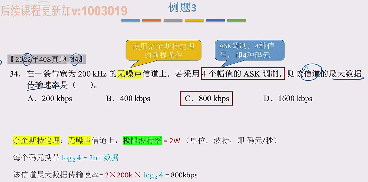 2023年的34题,这个题目要我们求信道的最大数据传输速率,这个题目告诉我们这是一个带宽为 200k赫兹的无噪声信道,看到无噪声信道就知道我们应该采用奈奎斯特定理。奈奎斯特定理说,无噪声信道上极限的波特率等于 2W,也就是码元的传输速率等于两倍的带宽。A、B、C、D几个选项都是以比特为单位,而不是以码元为单位去描述最大传输速率,所以我们需要把极限波特率转成极限比特率。接下来的问题就是要判断一个码元可以携带多少比特的数据。这个题目告诉我们采用了四个幅值的ASK调制,四个幅值意味着有四种信号,换个说法就是有四种码元,这就意味着一个码源可以携带 log以2为底4的对数,也就是两比特的数据。因此,极限比特率就应该等于极限波特率2乘以带宽,再乘以每个码元可以携带的比特数,最后的答案就是 800 kbps,答案选择C选项。再看下一个例题。