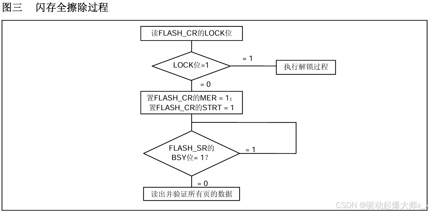 ② 置FLASH_CR的MER = 1表示全擦除,STRT = 1表示开始擦除。