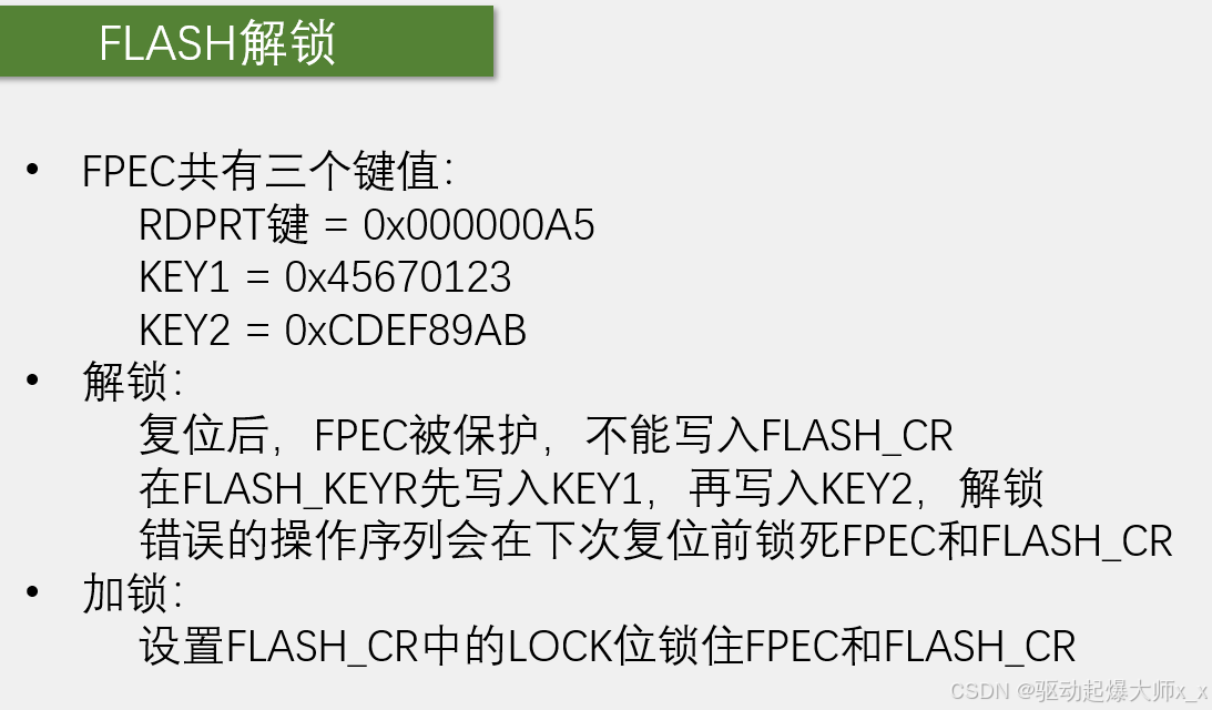 FPEC外设共设置了三个键,RDPRT键是解除读保护的键,Key1和Key2需要正确且按顺序输入,否则会锁死FPEC和FLASH_CR。
