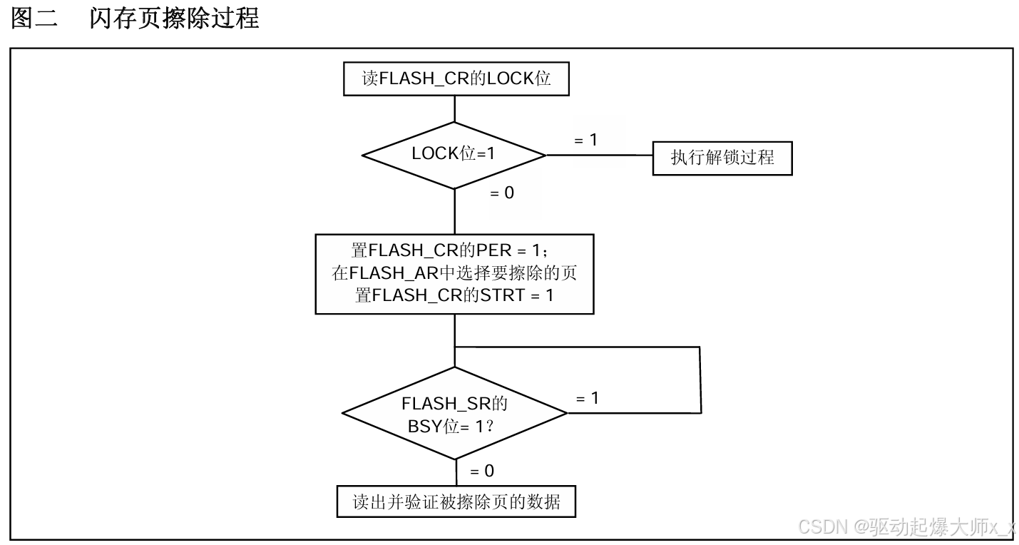 ② 置FLASH_CR的PER = 1表示页擦除,在FLASH_AR选择要擦除的页,STRT = 1表示开始擦除。
