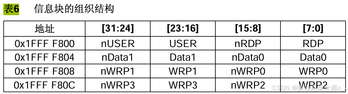WRP0/1/2/3: 配置写保护,每一个位对应保护4个存储页。(中容量)